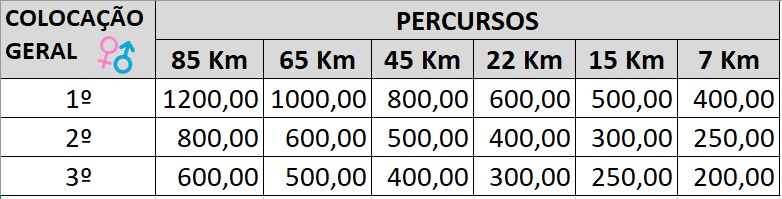 Haverá pódio para os 3 primeiros colocados masculino e feminino em todas as categorias dos percursos: