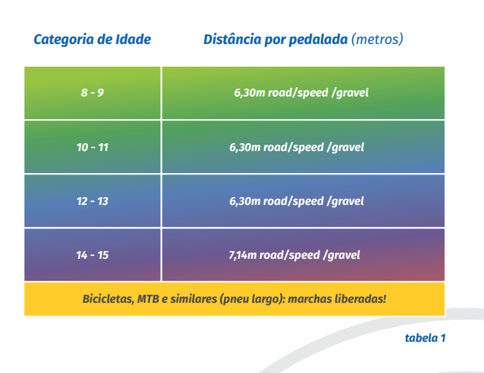 ➡️ Para atletas das categorias 08 a 11 anos, recomenda-se o uso de bicicletas com pneus mais largos (Gravel ou MTB). Caso seja utilizada bicicleta do tipo Speed/Road, o uso das marchas mais pesadas deverá ser limitado obrigatoriamente, conforme os parâmetros estabelecidos.