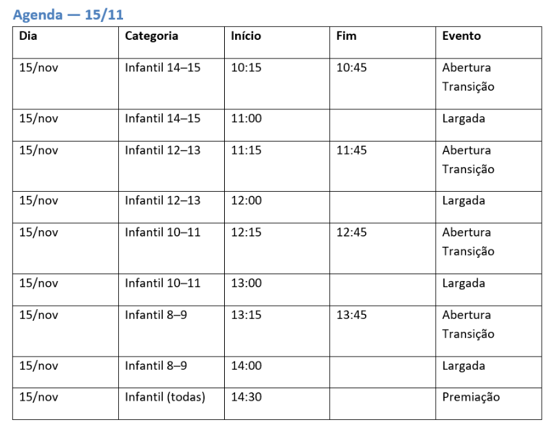 - Penalidades e condução da prova conforme Regulamento Infantil Brasil Triathlon e Congresso Técnico oficial.