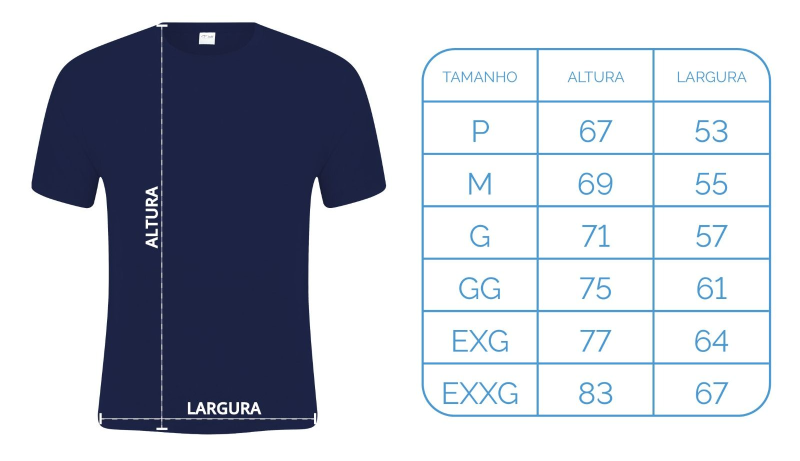 O tamanho da camiseta será escolhido pelo participante durante o processo de inscrição, de acordo com a grade disponível, não podendo ser modificado posteriormente. Confira as dimensões abaixo.